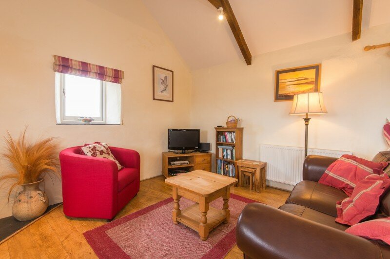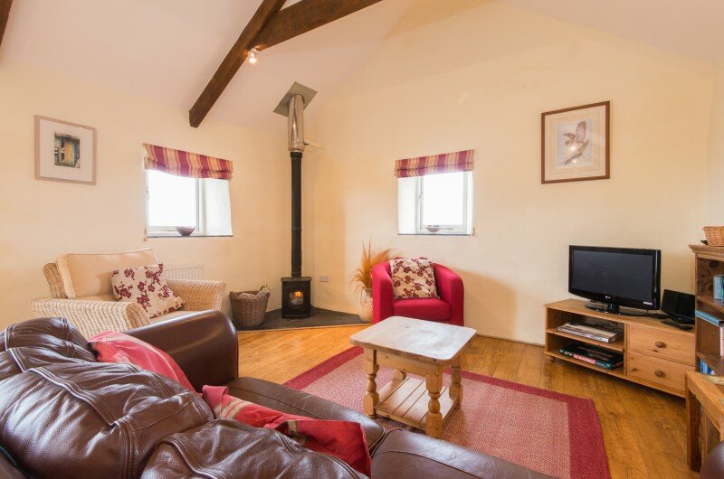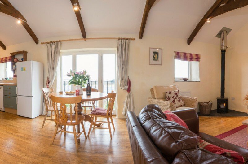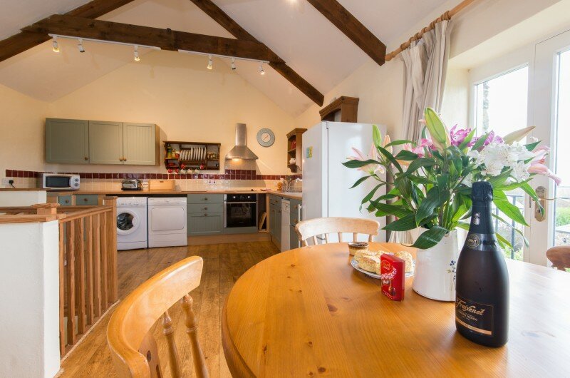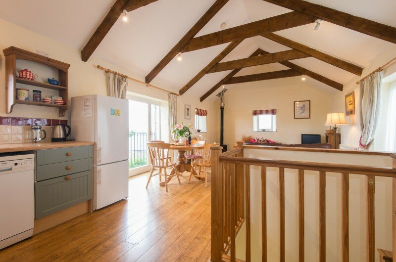 There is an entrance downstairs with the two en-suite bedrooms, hallway and stairs. Enter the other side of the cottage via a few steps into the large open plan living space with its cosy woodburner, well equipped kitchen and everything you need for a really homely holiday. Toddlers will find a few toys and books: grown ups will find things like books, maps, the dvd stock list, games, the wi-fi code (just in case you have to keep in touch with the outside world), tea and coffee, treats and if you have asked for one… a cake, a cream tea or large bowl of fruit!
